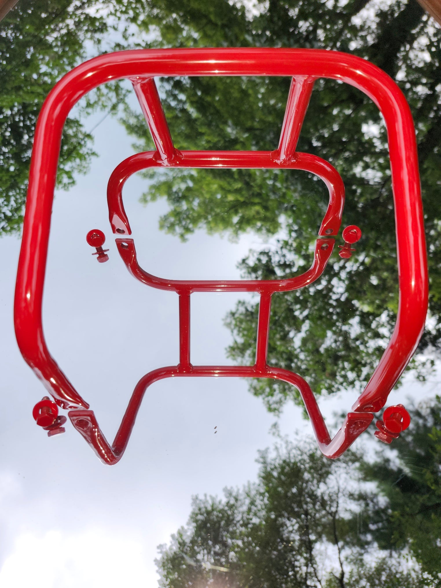 Vintage styled aftermarket headlight guard for the 1985-1986 model years of Honda ATC250r. Made by hand using 16 gage steel tubing. Guards are made using jigs, tig welded assembly, then media blasted and powder coated. Comes with coated to match nuts and bolts, (hardware) too. Easy instillation just bolts into the existing holes in your triple trees.